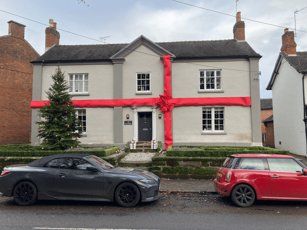 A huge red ribbon wrapped around the front of the house – playful, confident, impossible to miss.